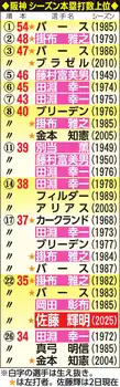 打った瞬間、右翼・上林も追うのをすぐに諦めた会心の一撃は中段へ着弾した。3試合ぶりの一発となる先制2ランで自己最多タイの5試合連続打点。強打を武器に球団初の日本一に輝いた85年岡田彰布のシーズン35本塁打にも肩を並べた。また、シーズンの勝利打点16度も両リーグトップを走る同僚の森下の17度に迫った。