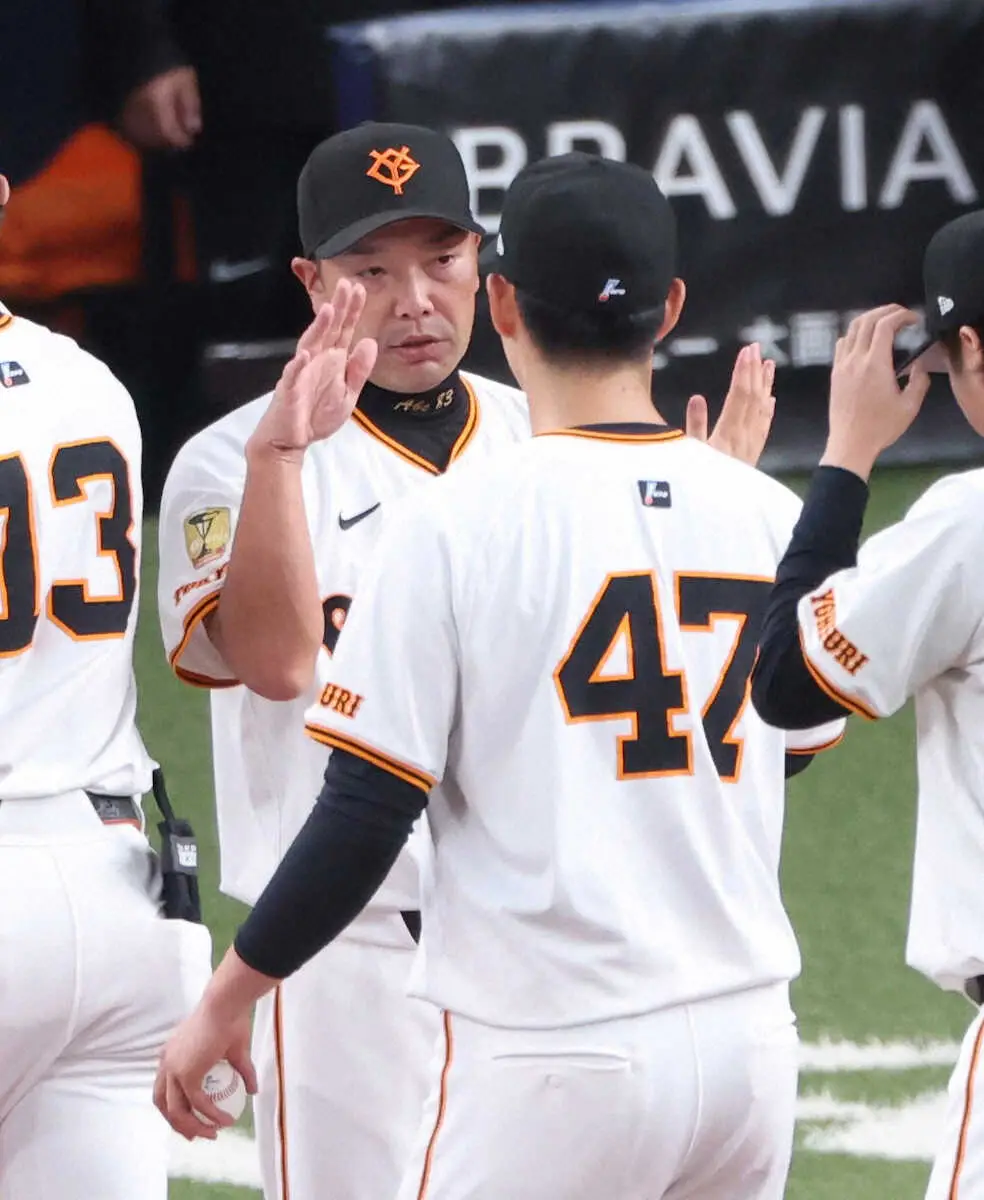 ヤクルトに勝利し、森田を迎える阿部監督(左) (撮影・平嶋 理子)