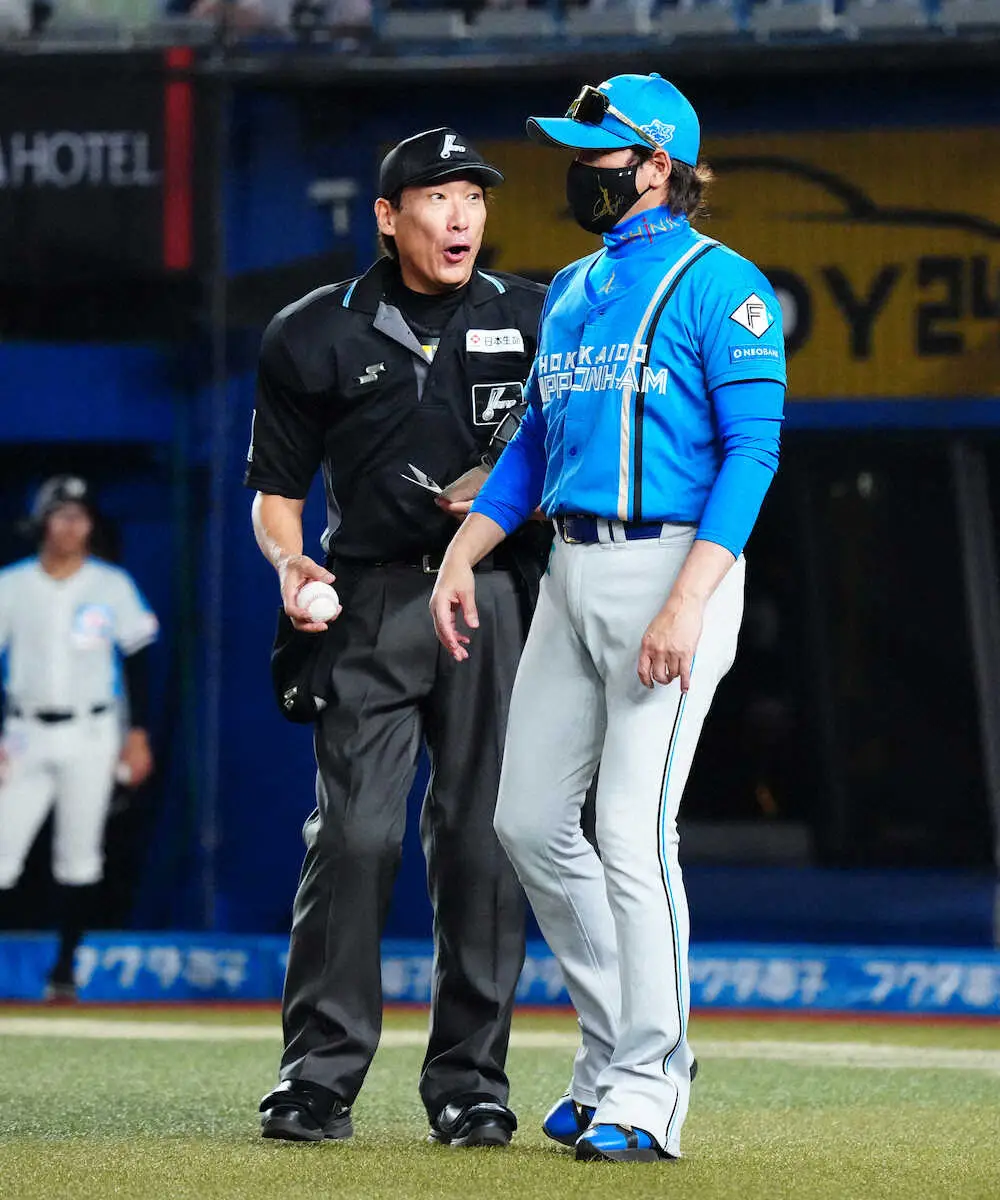 <ロ・日>4回の攻撃を終え、投手交代を告げる新庄監督。左は秋村球審(撮影・長久保 豊)