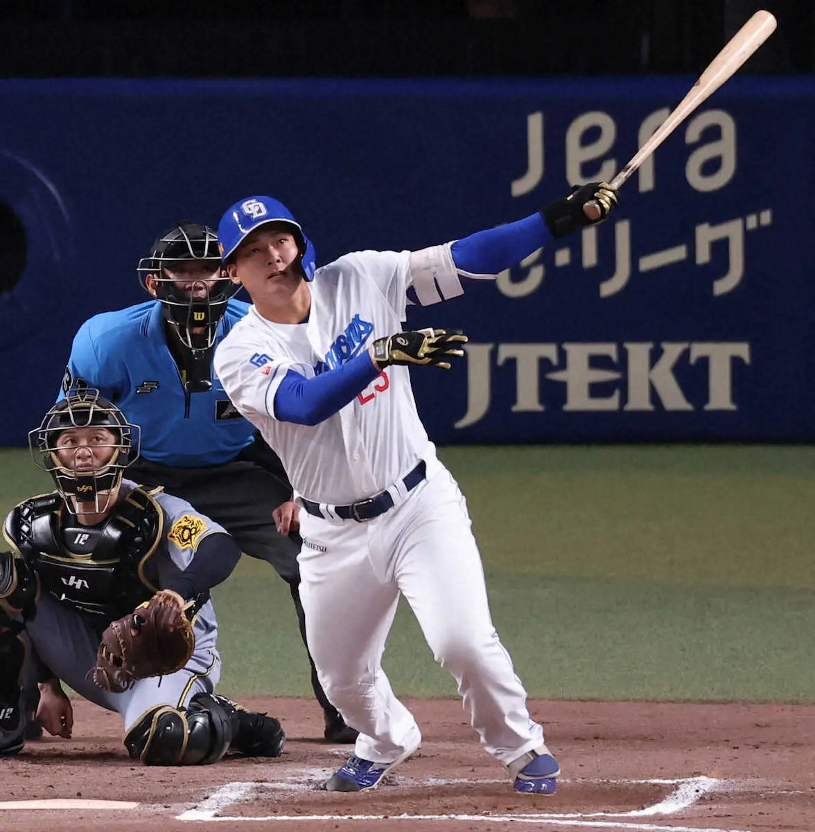 待望の一発だ。6回先頭、中日・石川昂が今季初本塁打となる左越えソロを放ち、「何とか対応できました。チームに貢献できてうれしいです」。不振で6月17日に出場選手登録を抹消。この日、2カ月半ぶりに1軍昇格して即スタメン起用され、期待に応えた。今季12球団の開幕4番では最遅1号。井上監督は「本人もホッとしたと思う」と、飛躍を期待した。
