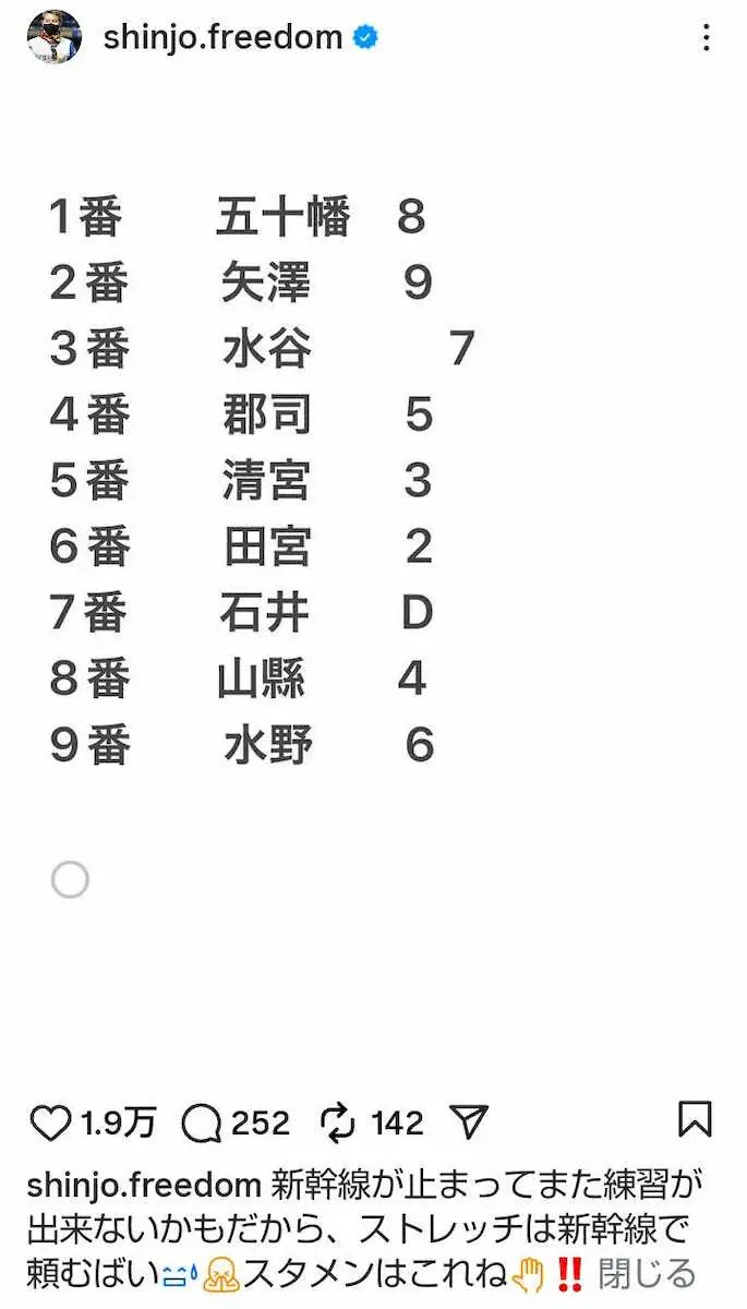 【日本ハムの新幹線ドタバタ移動】当初の予定より4時間21分遅れで新大阪駅到着 インスタでスタメン発表