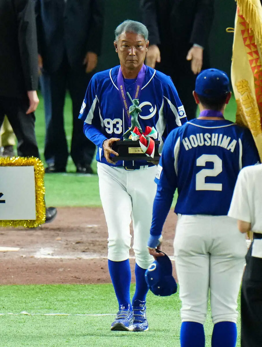 <三菱自動車岡崎・王子>小野賞を獲得し、トロフィーを受け取った王子・湯浅監督(撮影・木村 揚輔)