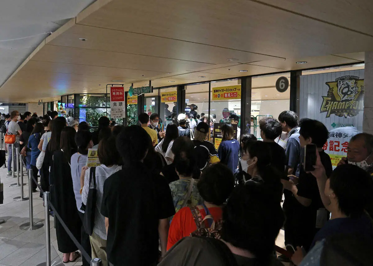 中には、阪神のユニホームを着用して来店する客も。阪神優勝を記念した商品が並び、各店舗で列をなしていた。