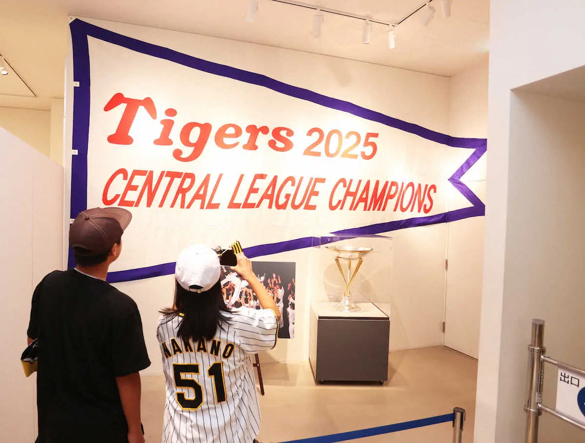 兵庫県西宮市の甲子園歴史館で、阪神の優勝ペナントとトロフィーなどのリーグ優勝特別展示が始まった。同館は9日から入館者などに優勝記念カードを配布。藤川監督の背番号にちなんだ全22種類のデザインがあり、先着合計4万人にプレゼントされる。館内の名場面シアターでは胴上げやビールかけ時の映像が流れており、担当者は「臨場感を味わってほしい。より鮮度のあるうちに体感してもらえたら」と語った。展示は来年2月1日まで行われる予定だ。