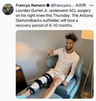 同記者は右膝に器具を装着したグリエルがサムズアップポーズでカメラに写る写真を投稿し「グリエルは木曜日に右膝の前十字靱帯再建術を受けた。回復まで9~10カ月を要する」と記した。