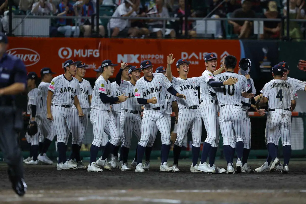 <日本・パナマ>9回、サヨナラ勝利を喜ぶ日本ナイン(撮影・松永 柊斗) Photo by スポニチ 【U18W杯】侍が決勝進出!パナマに劇的サヨナラ勝ちで連覇王手 激闘タイ… ギャラリーで見る この記事のフォト 2025年09月12日の画像一覧 もっと見る 2025年09月12日の画像をもっと見る