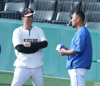 阪神藤川球児監督(45)が14日の中日戦(甲子園)を前に、今季限りで引退する中日・中田翔をねぎらった。中日勢が練習を始めると、ベンチを出て三塁側へ足を運び、数分間、コミュニケーションをとった。中田が日本ハムに在籍したころから親交がある。ダルビッシュ(米大リーグ・パドレス)とともに食事をしたことがきっかけで、この日も「翔」と呼んでいた。