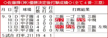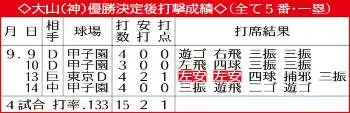 打線の沈黙も痛かった。8回まで大野に対し散発4安打。1点差で迎えた9回も松山の前に森下、佐藤輝、大山があえなく3者凡退となった。7日のリーグ優勝決定後から2度目の零敗。チームは5試合で1勝4敗とお疲れ気味だ。