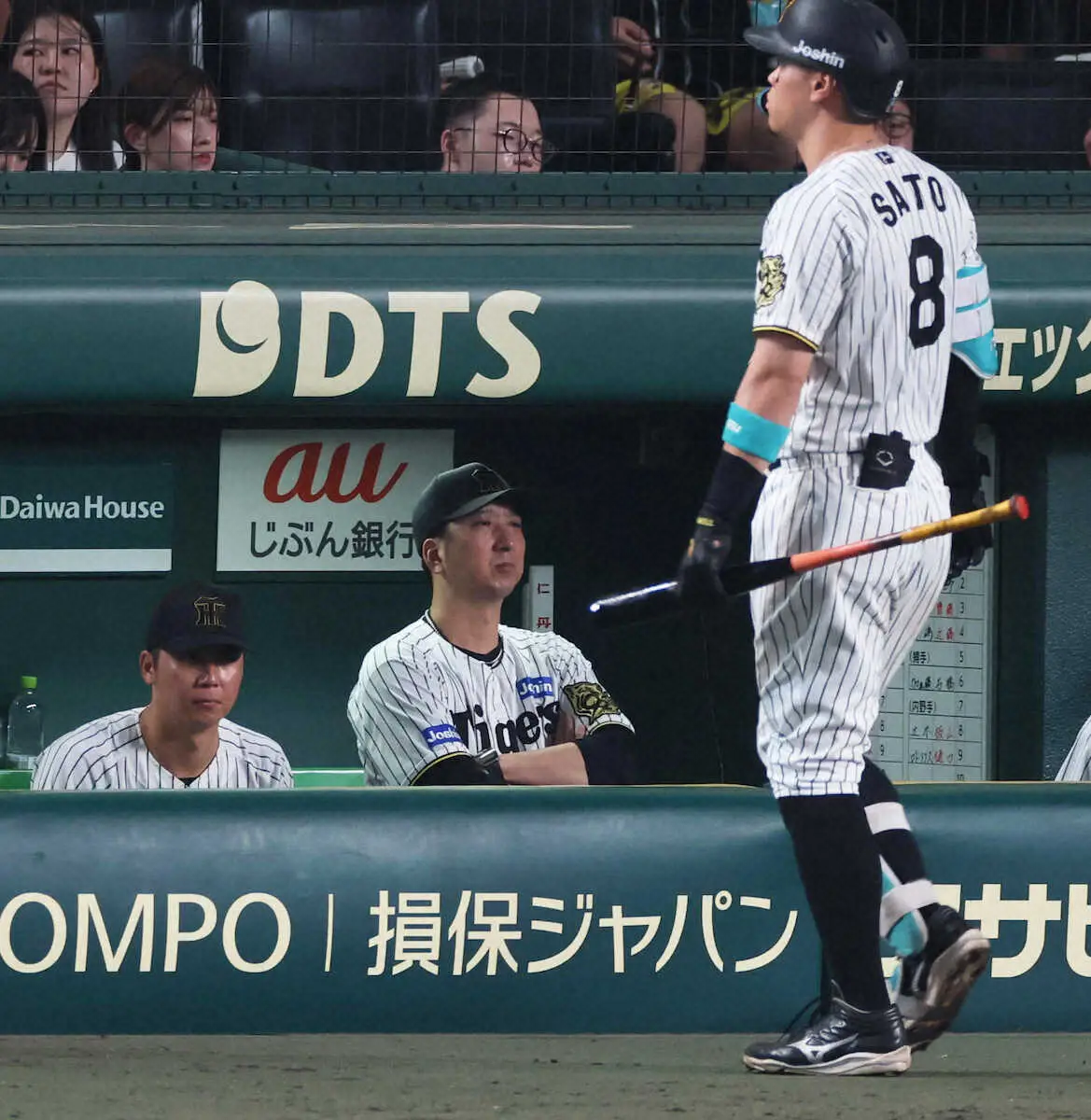 <神・中21> 9回、佐藤輝が空振り三振に倒れ、藤川監督は厳しい表情(撮影・大森 寛明)