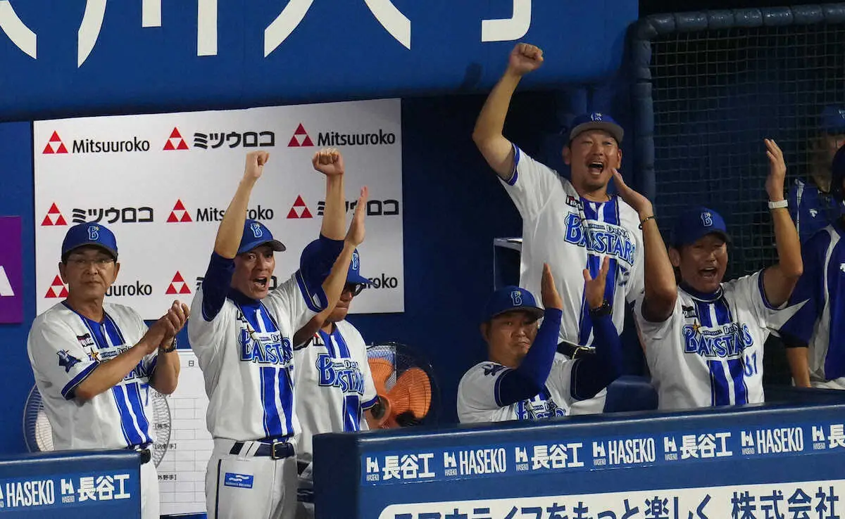 <D・巨>6回、石上の先制打に沸く三浦監督(右端)らDeNAベンチ(撮影・河野 光希)