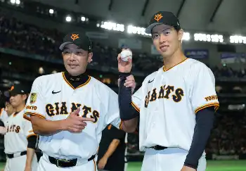 そのなかで「さまぁ~ず」がVTRを通じてメッセージ。大竹からは、8月6日のヤクルト戦(東京D)で森田がプロ初先発初勝利した際に撮影された阿部慎之助監督(46)との記念写真について「左ピッチャーだけど右でボール持ってたのなんで?」と素朴な疑問が出た。