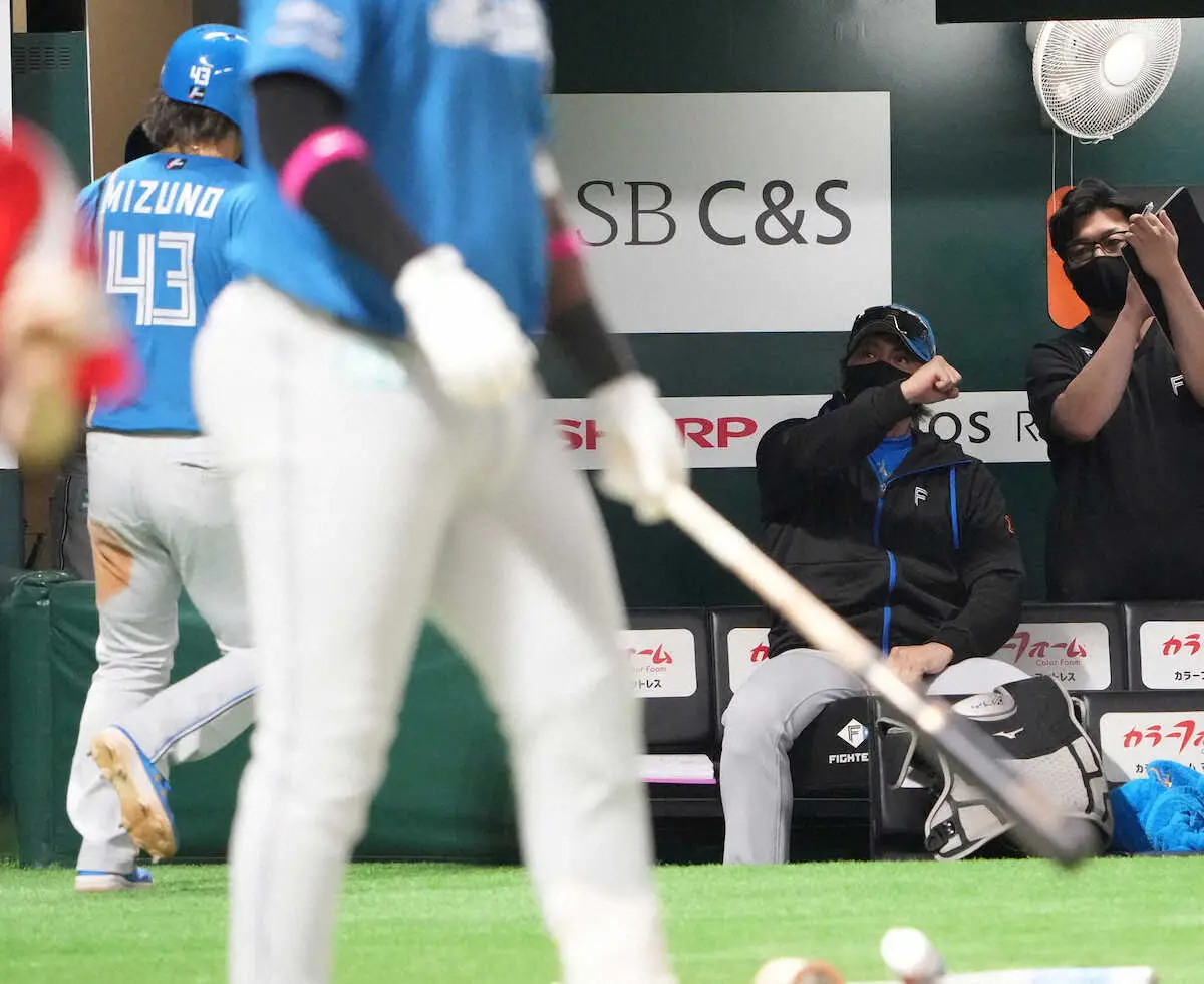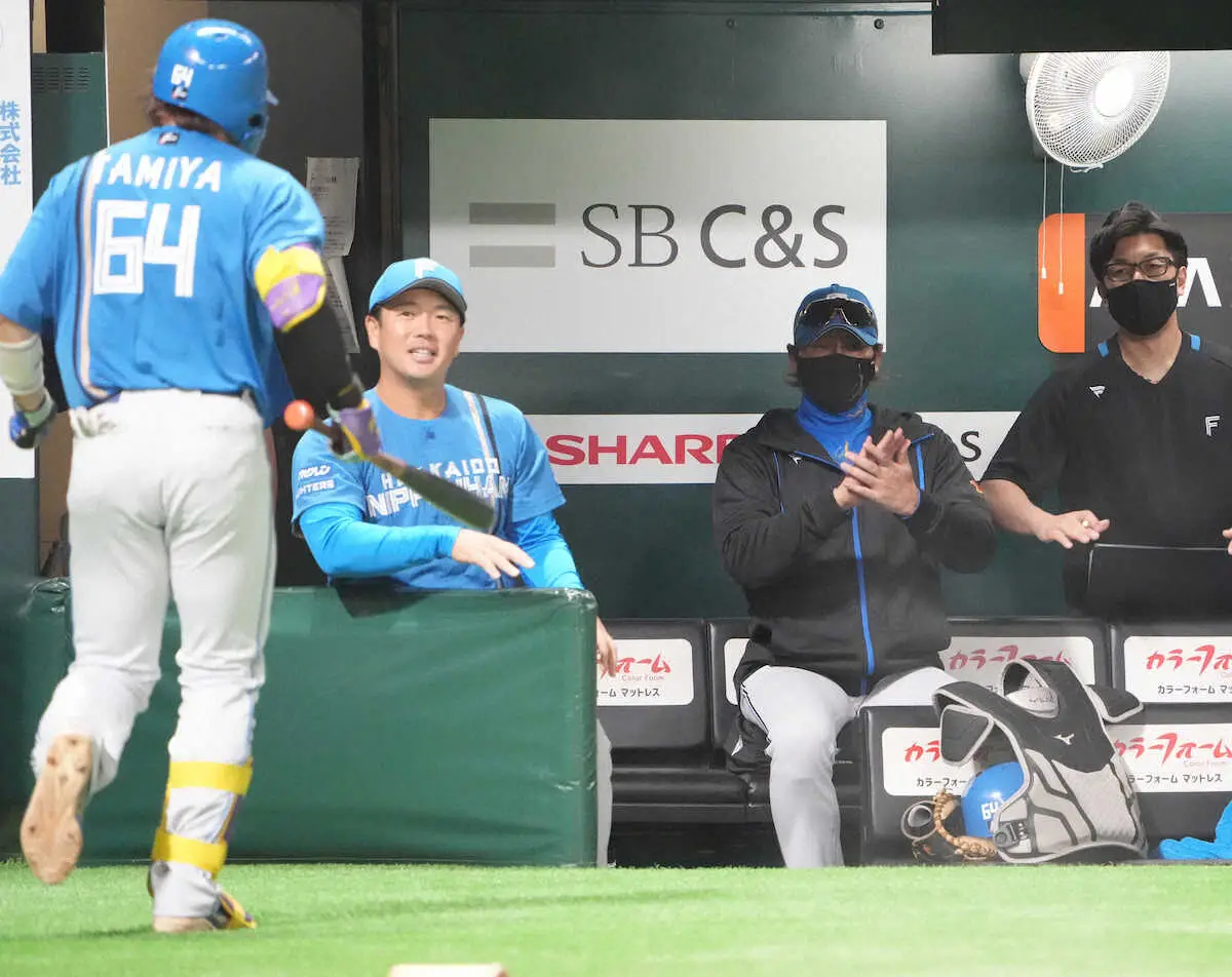 <ソ・日>2回、送りバントを決めた田宮(左)に拍手する新庄監督(撮影・岡田 丈靖)