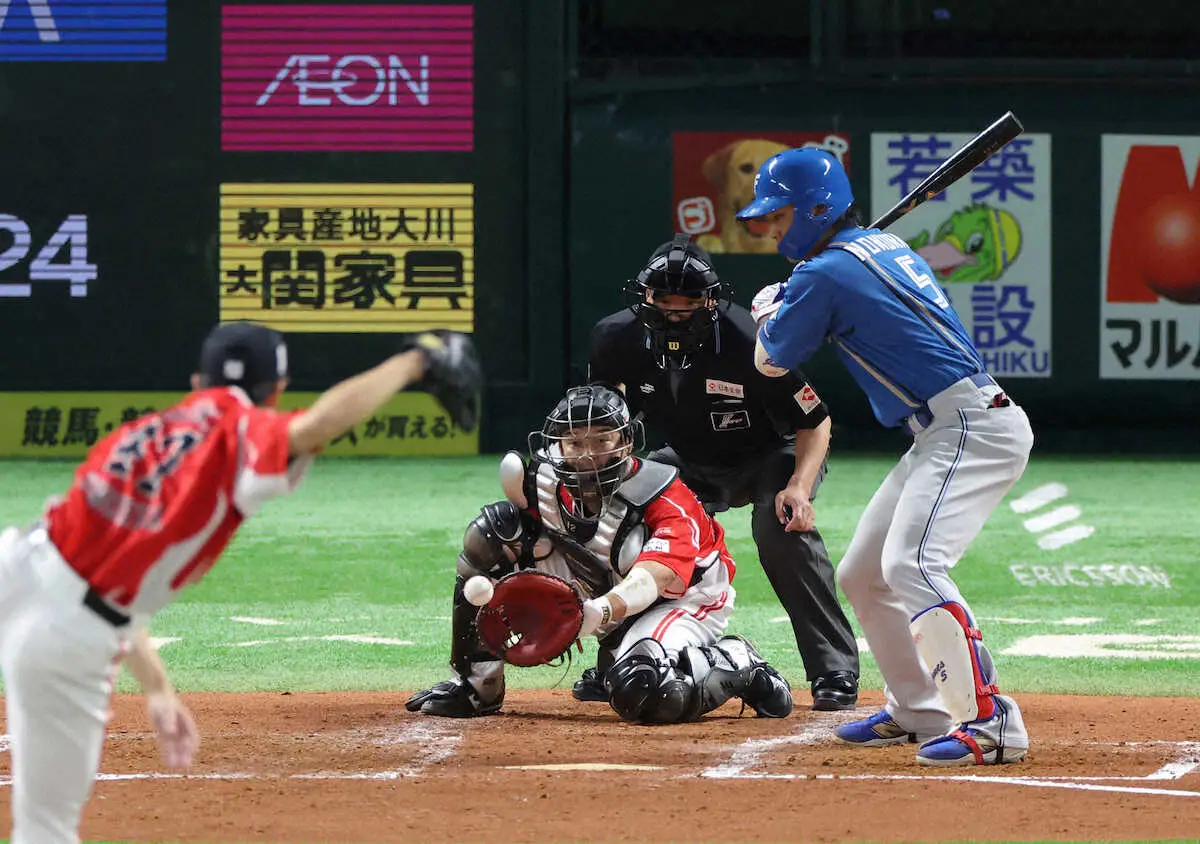 <ソ・日>2回、押し出し四球を選ぶ野村。投手・大関(撮影・岡田 丈靖)