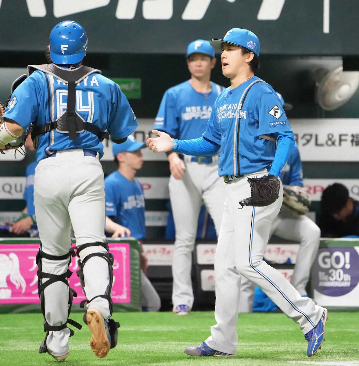 <ソ・日>4回を投げ終えた北山は捕手・田宮(左)とタッチを交わす(撮影・岡田 丈靖)