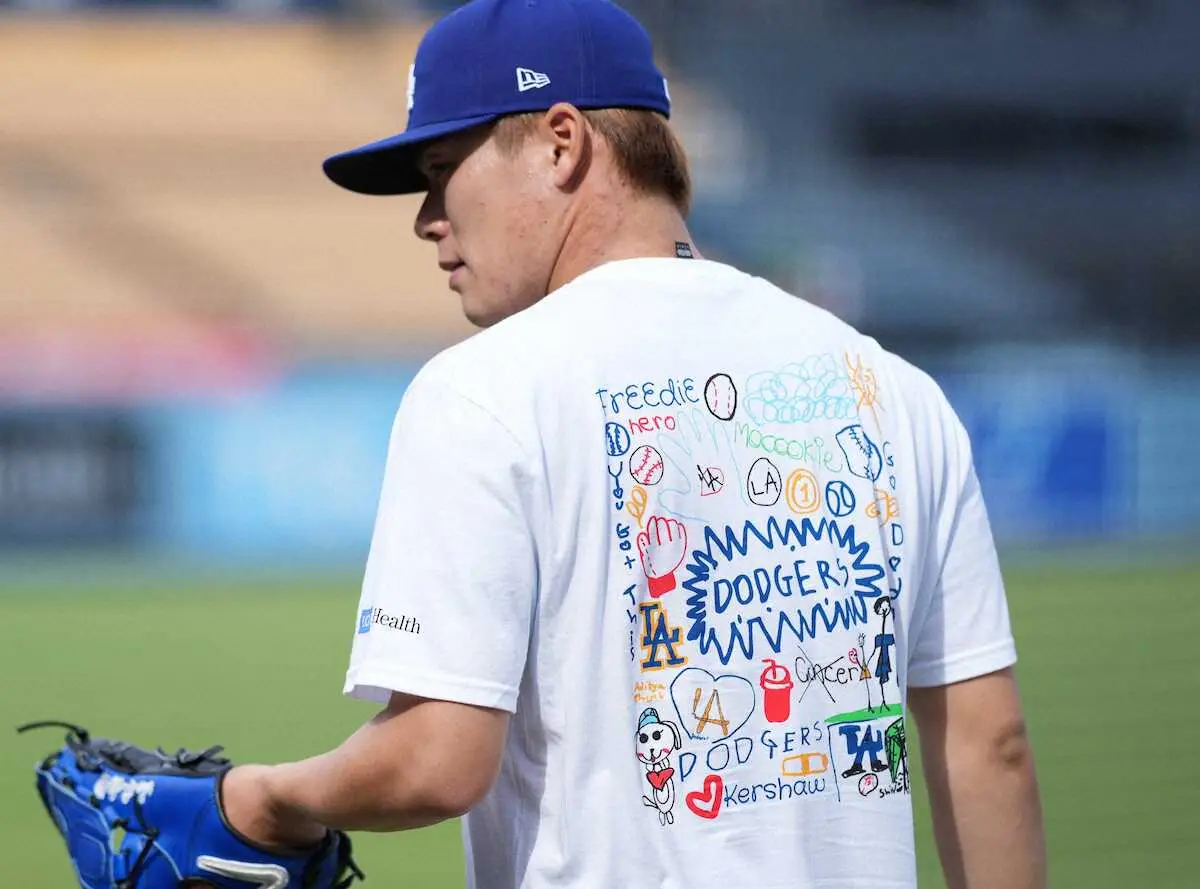ドジャース「小児がん啓発ナイト」開催 選手はお揃いTシャツで練習&患者が描いた大谷翔平ら似顔絵も公開
