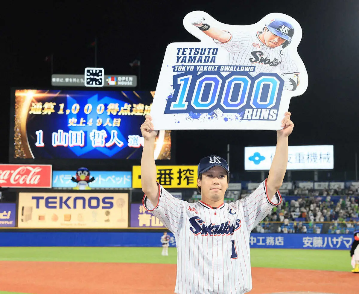 ヤクルト・山田が豪快な一発で金字塔を打ち立てた。2回無死で左翼へ10号ソロ。史上49人目の通算1000得点を達成すると同時に、自身の球団記録を更新する12年連続2桁本塁打にも到達し連敗ストップに貢献した。「この記録は自分の力だけじゃ達成できない。49人目と聞いて凄い数字なんだと。感謝の気持ちでいっぱい」。記念のボードを手に喜んだ。
