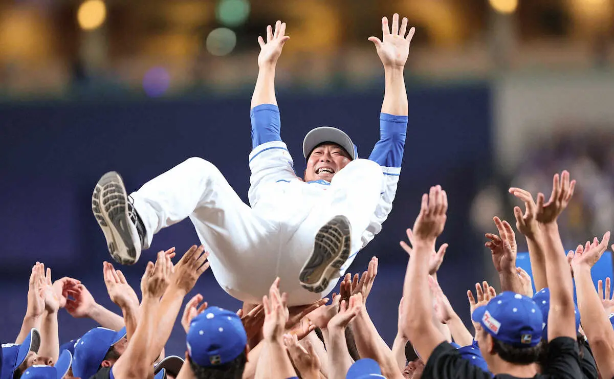 <中・ヤ>引退セレモニーで胴上げされる中田(撮影・椎名 航)