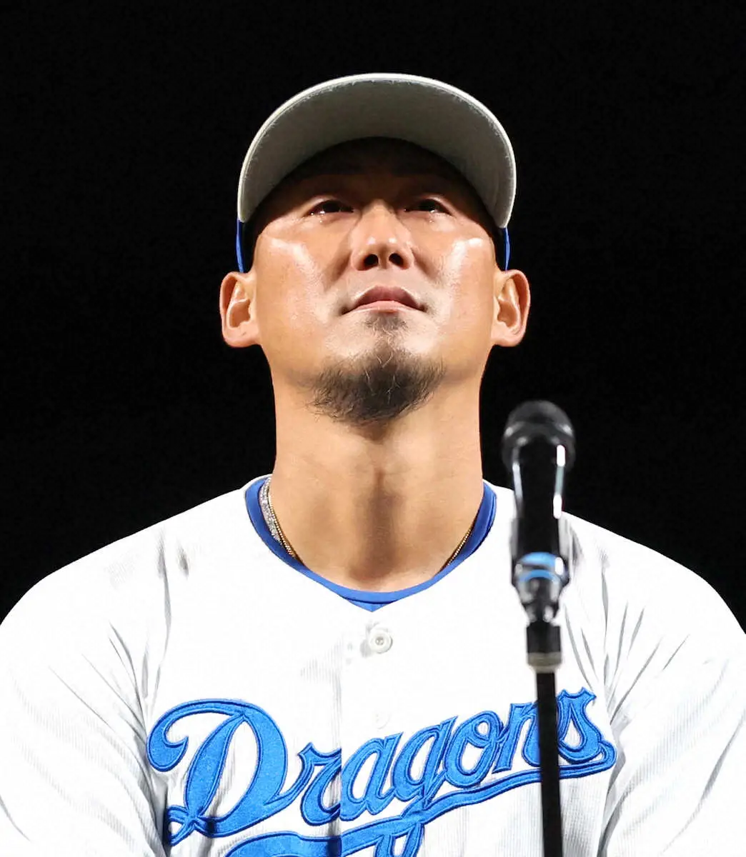 <中・ヤ>引退セレモニーで涙を流す中田(撮影・椎名 航)