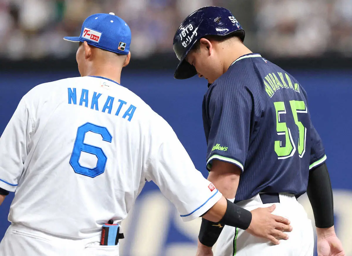 第1打席は1死一、三塁から二ゴロの間に先制点を挙げた村上。併殺崩れで一塁に残った村上は、今季限りでの引退を発表し、引退セレモニーが行われる試合に先発出場していた中田にあいさつした。中田は笑顔で腰に手を当て感謝の意を示した。