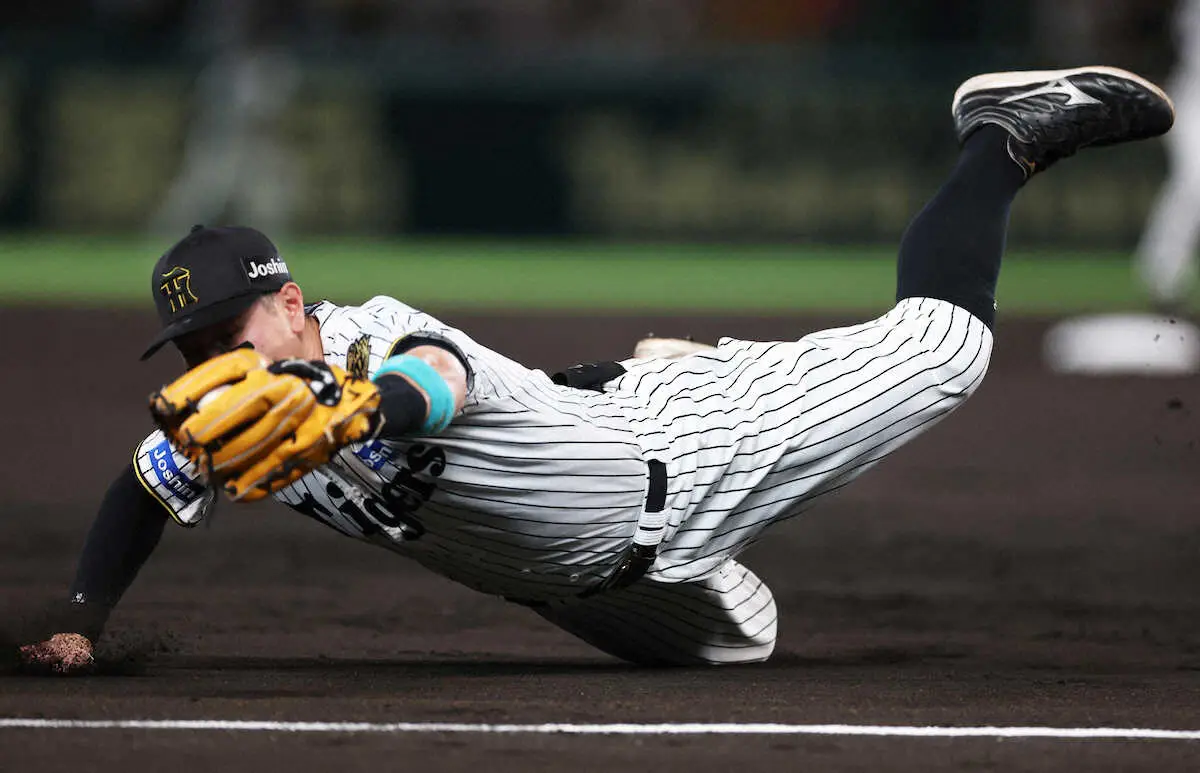 3試合ぶりスタメン復帰の阪神・佐藤輝が、この日は守備で沸かせた。3回1死、蝦名の強烈な三塁線の打球を飛び込んでキャッチ。素早く起きて一塁へ矢のような送球をした。やや本塁側にそれたボールは、大山の巧みなグラブさばきに助けられアウト。スタンドからは拍手喝采と「輝コール」。マウンドの早川からはお辞儀をされた。