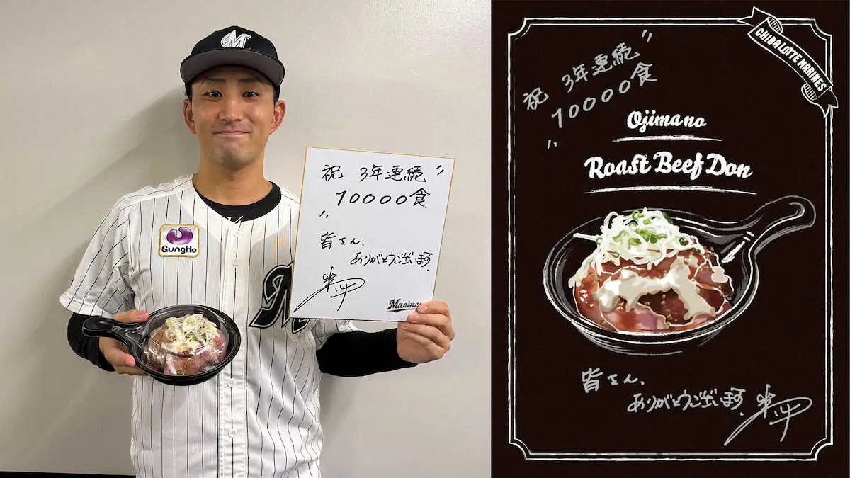小島は「皆さんのおかげで3年連続1万食を突破することができました。僕自身大好きな『ロービー丼』をたくさんの方に食べて頂けて本当に嬉しい気持ちでいっぱいです。ZOZOマリンでの残りの7試合は記念ステッカーが配布されるので、引き続き『小島のローストビーフ丼』」をよろしくお願いします!」とPRした。