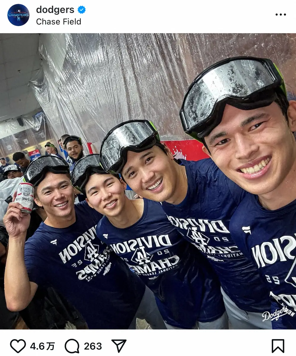 ドジャース、“日韓4兄弟”笑顔のショット公開!ファン歓喜「いい顔してる」 地区4連覇で美酒