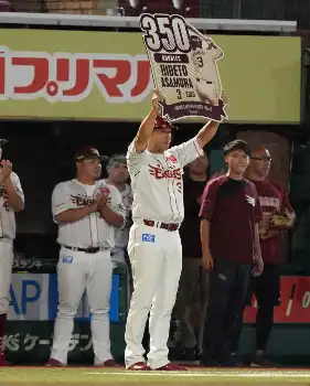 楽天・浅村栄斗内野手(34)が1―0の初回2死一塁で、上沢から中堅フェンス直撃の適時二塁打を放った。2点目を奪う貴重な一打で、通算350二塁打に到達。初回の攻撃終了後、記念ボードを掲げて、ファンの歓声に応えた。