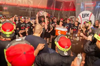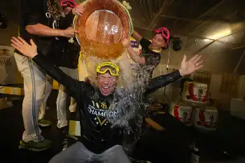 ソフトバンク 歓喜のビールかけ!ビール3000本が泡に