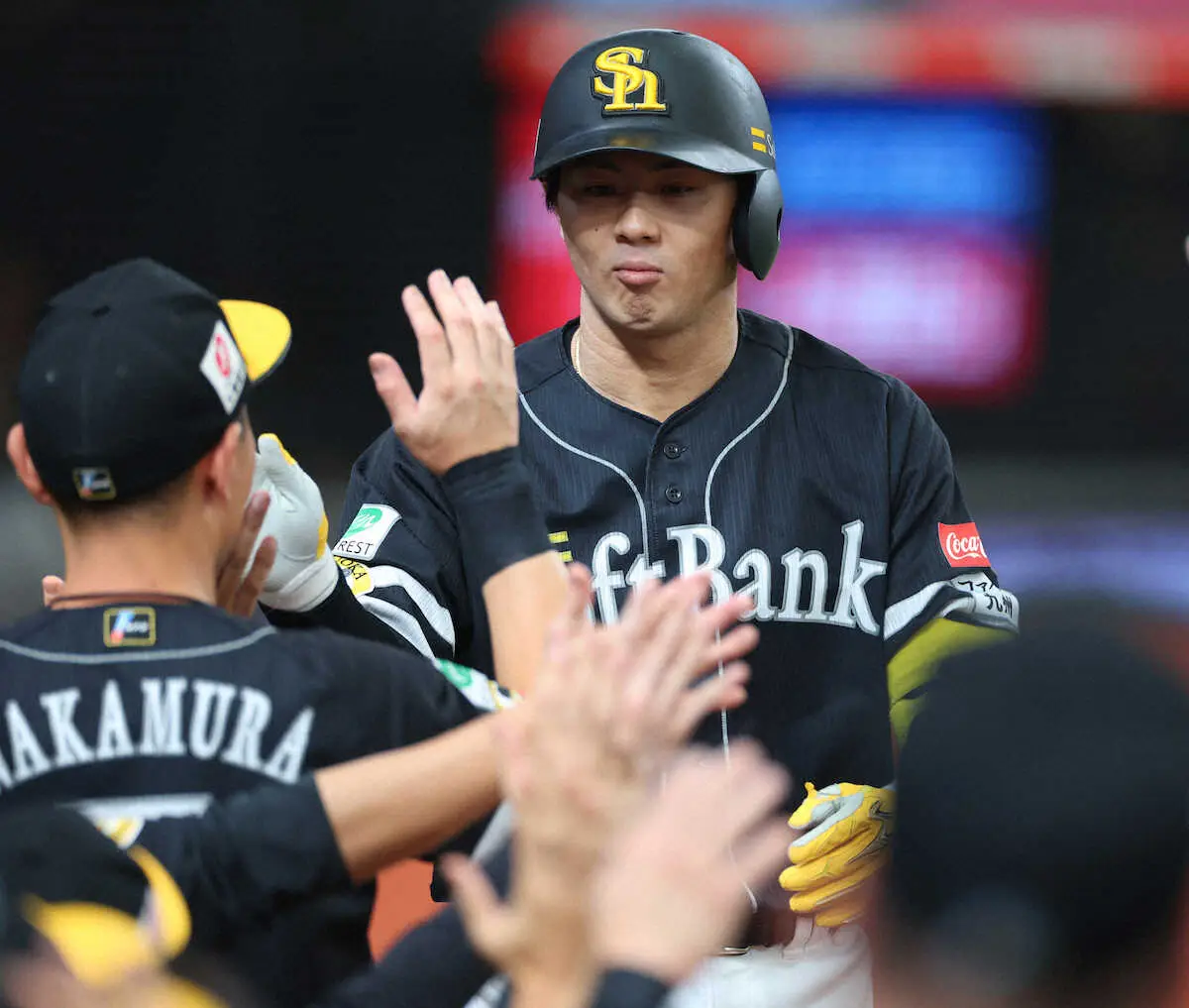 <西・ソ25>8回、ソロを放ちハイタッチする佐藤直 (撮影・白鳥 佳樹)
