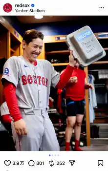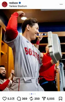 レッドソックスの球団公式インスタグラムが9月30日(日本時間10月1日)に更新され、この日のヤンキースとのワイルドカードシリーズ第1戦で逆転打を放った吉田正尚外野手(32)が祝われている写真を公開した。