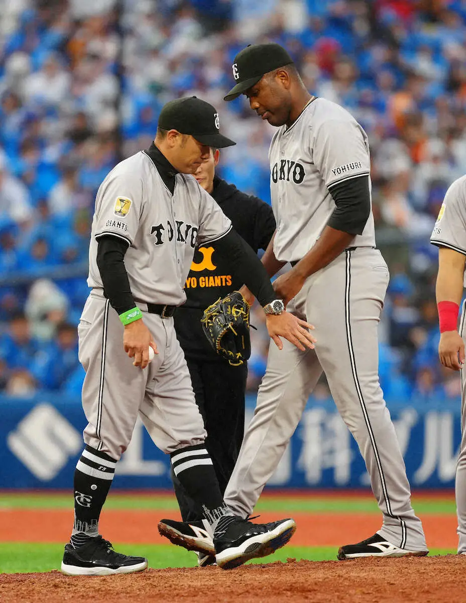 <D・巨>7回、バルドナード(右)の交代を告げた阿部監督(撮影・島崎忠彦)