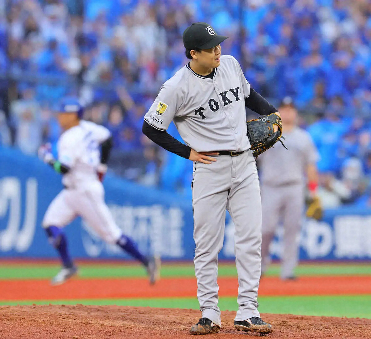<D・巨>6回、筒香(左)にソロを浴びる山崎(撮影・光山 貴大)