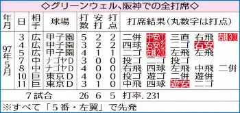 グリーンウェルさんは85年にレッドソックスでメジャーデビューした外野手。12年間同球団でプレーし、通算打率・303、130本塁打を記録した。阪神とは96年オフに当時では球団史上最高額となる推定年俸約4億円、2年契約で入団。米国フロリダ州の豪邸で入団会見を行うなど、吉田義男監督の下で阪神の救世主になると高い注目を集めた。