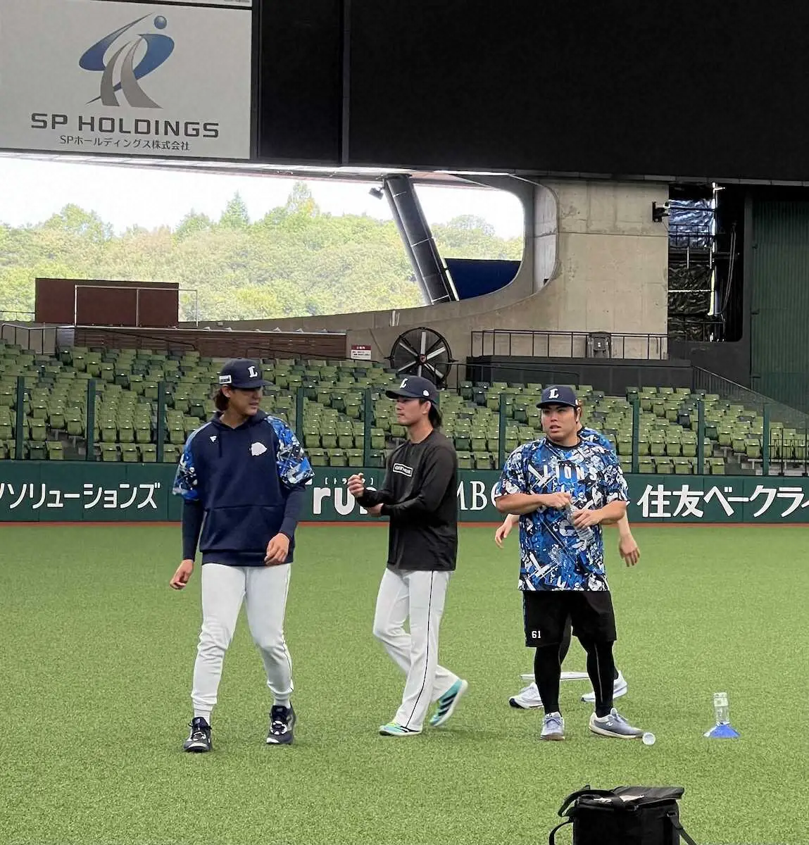 全体練習に臨む(左から)西武・高橋、今井、平良