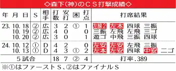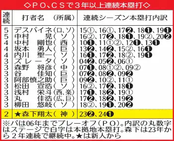 ○…森下(神)は新人の23年からCSで2年連続本塁打を放っているが、これは09~10年の野本圭(中)以来2人目の記録。ファイナルSで本塁打を記録すれば、史上初の新人から3年連続CS弾となる。新人からに限らず、CSの3年連続本塁打も阪神では初めてになる。
