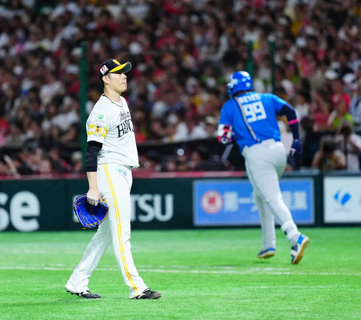 <ソ・日>8回、レイエスに同点ソロを許し、ガックリの松本裕(撮影・長久保 豊)