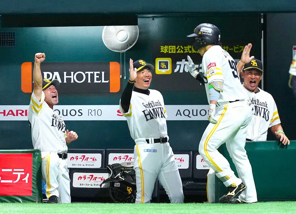 <ソ・日>7回、先頭の野村勇が先制ソロ。最高の笑顔の小久保監督(中央)らに迎えられる(撮影・長久保 豊)