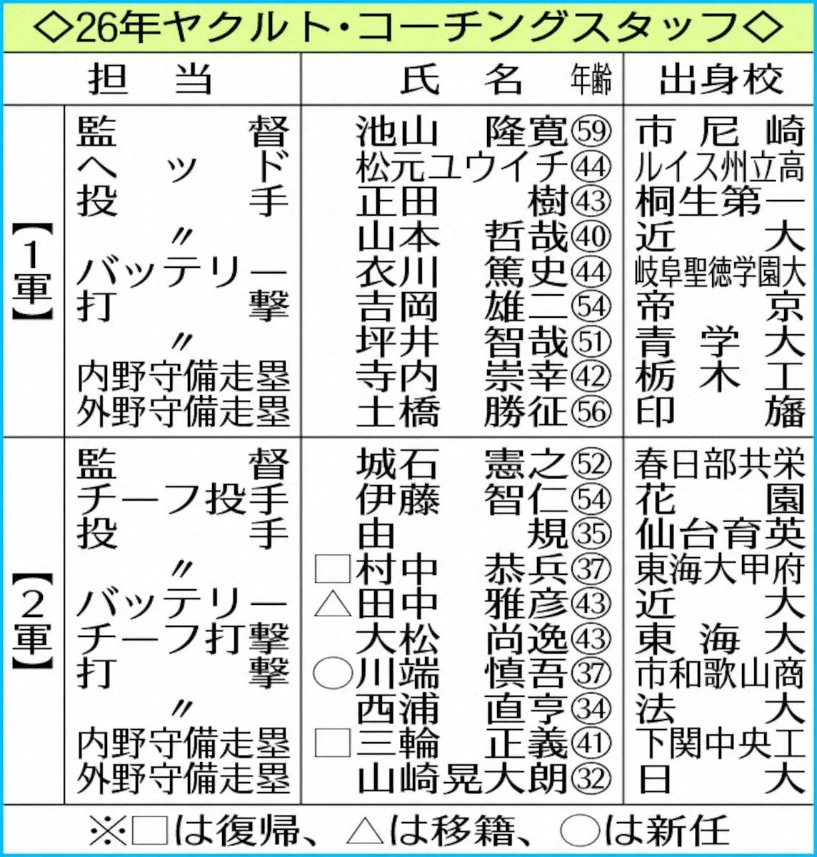池山新監督の参謀役となる1軍ヘッドコーチに今季まで1軍外野守備走塁兼作戦コーチだった松元コーチが就き、城石2軍総合コーチが2軍監督に就任する。
