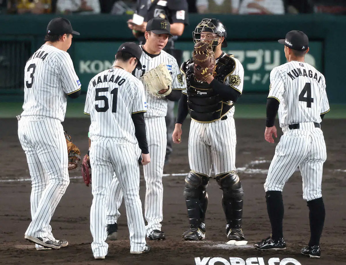 セCSファイナルS<神・D>3回、ピンチを迎え、坂本(中央右)から声をかけられる村上(撮影・椎名 航)