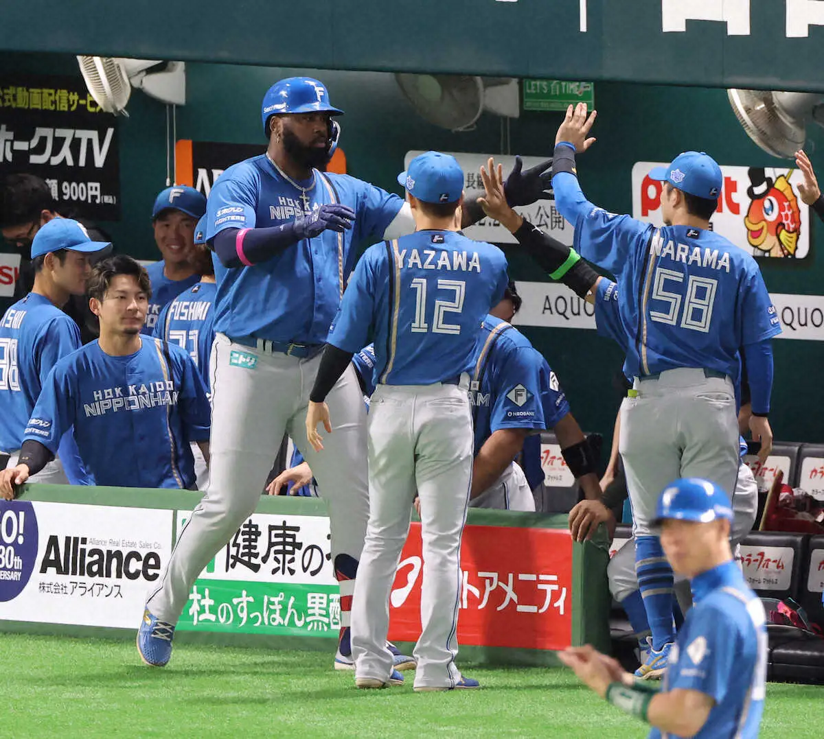 <ソ・日>4回、ソロを放ったレイエスはナインの出迎えを受ける(撮影・岡田 丈靖)
