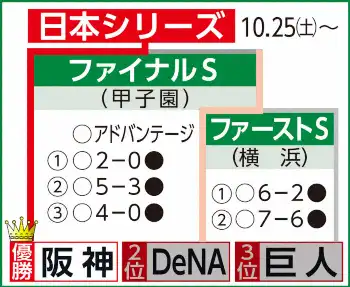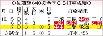 「2025 JERA クライマックスシリーズ(CS) セ」のファイナルステージ(S)第3戦が17日に行われ、リーグ覇者の阪神が2位のDeNAに3連勝を飾り、1勝のアドバンテージを含めて4勝0敗として日本シリーズ進出を決めた。23年以来2年ぶり8度目で、無敗突破は23年に続き2度目。佐藤輝明内野手(26)が初回、球団生え抜き4番初のCS弾となるバックスクリーンへの先制3ラン。3戦で計5打点を挙げ、主砲の任務を果たした。