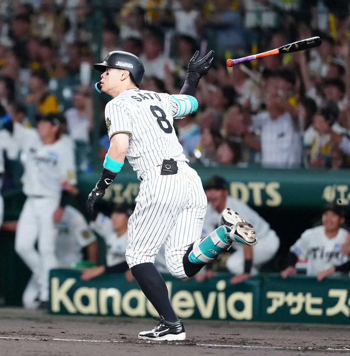 <神・D>初回、3ランを放つ阪神・佐藤輝(撮影・島崎忠彦)