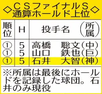 15日の第1戦は1回1/3、回またぎを難なくこなし、16日の第2戦は1回を3人斬り。唯一CS3連投となったこの夜も強力打線を圧倒した。これで、CSファイナルSでは歴代最多タイの通算5ホールド目をマークした。