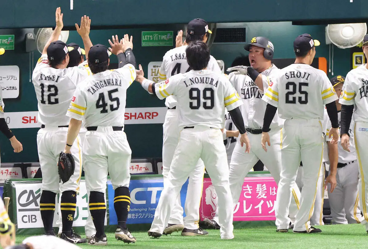 <ソ・日>日本シリーズ進出を決めナインとタッチを交わす小久保監督(中央)(撮影・岡田 丈靖)