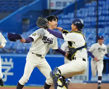 明大・大川が最後のアウトを空振り三振で取り、捕手の小島河はマウンドに突進した。応援席の大歓声の中、4連覇を狙った早大に2連勝。1―0の零封勝利で5季ぶりに王座を奪回し、選手たちが一つになって雄叫びを上げた。