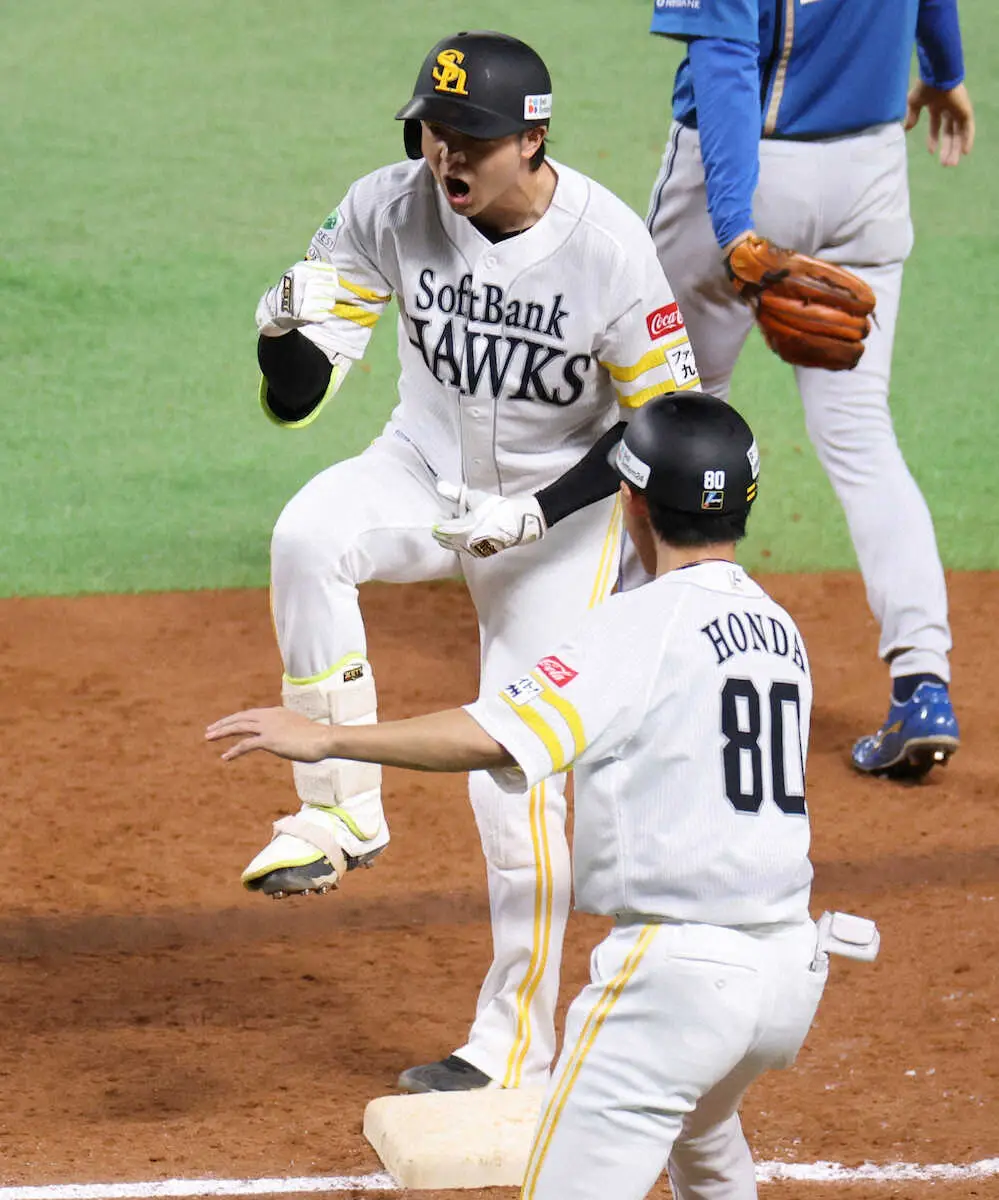 <ソ・日>5回、勝ち越し打を放ち、塁上でほえる川瀬 (撮影・須田 麻祐子)