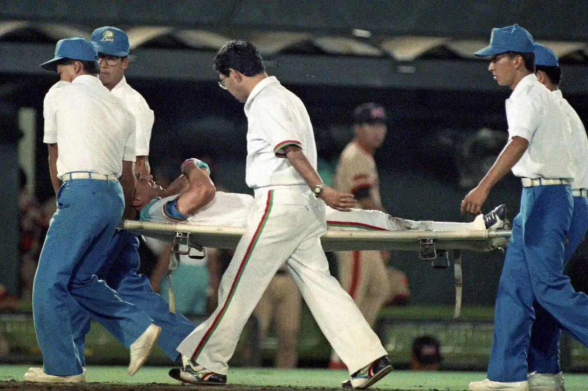 89年8月2日のダイエー戦で右肩を脱臼し、タンカで運ばれる