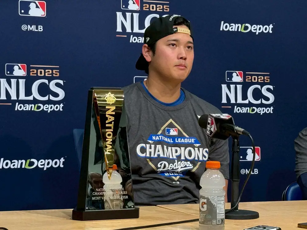 この日のクラブハウス内には、大谷がMVPに輝いた際に贈られたトロフィーが中央付近に鎮座。「ナショナル・リーグチャンピオンシリーズMVP」の刻印部分が隠れるように「TEAM EFFORT」(チーム全員の努力)と書かれた紙が置かれていた。