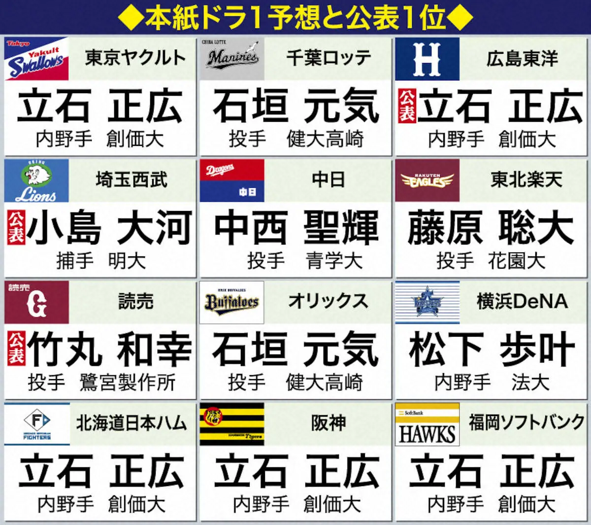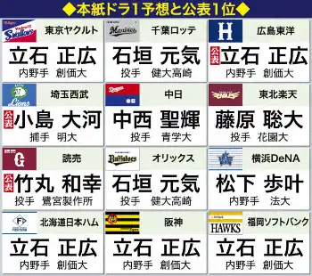 (左上から時計回りに)青学大・小田、法大・松下、Honda・片山、創価大・立石、創価大・大島、東北福祉大・桜井 Photo by スポニチ ドラフト会議 菊地選手イチ推し!セ・リーグ6球団の補強ポイント ギャラリーで見る この記事のフォト 2025年10月23日の画像一覧 もっと見る 2025年10月23日の画像をもっと見る