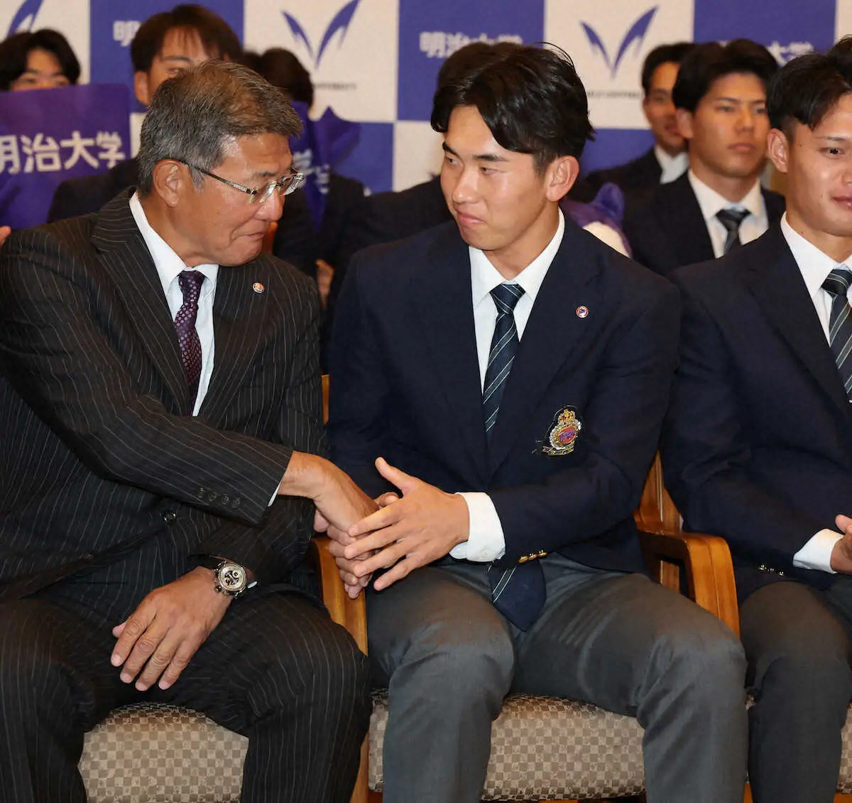<ドラフト会議・明治大>西武から1位指名を受け、戸塚監督(左)と握手を交わす明大・小島(撮影・篠原岳夫)